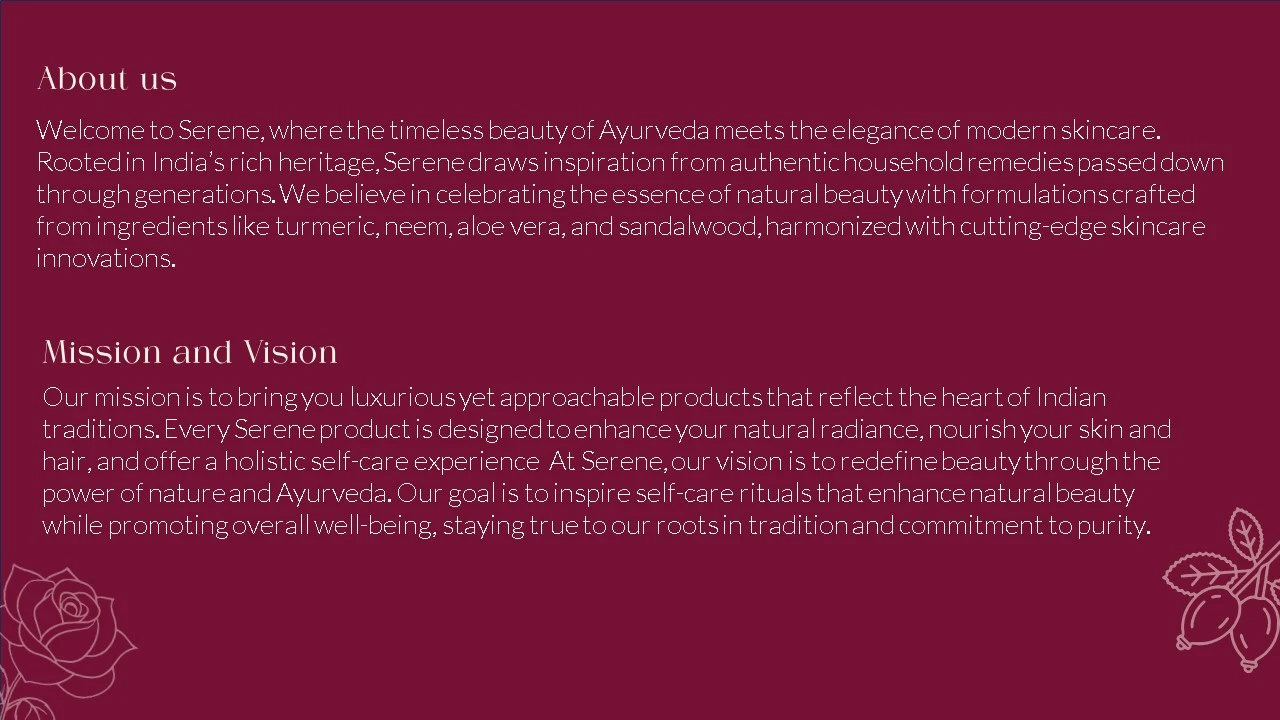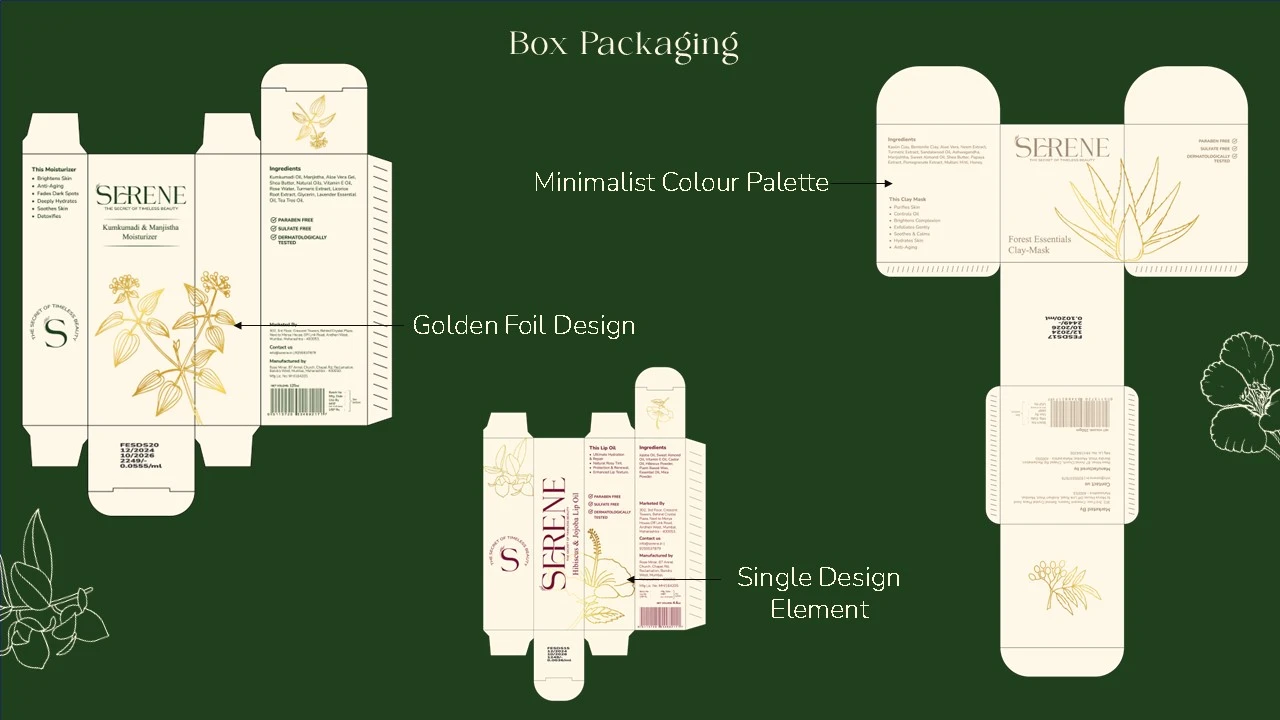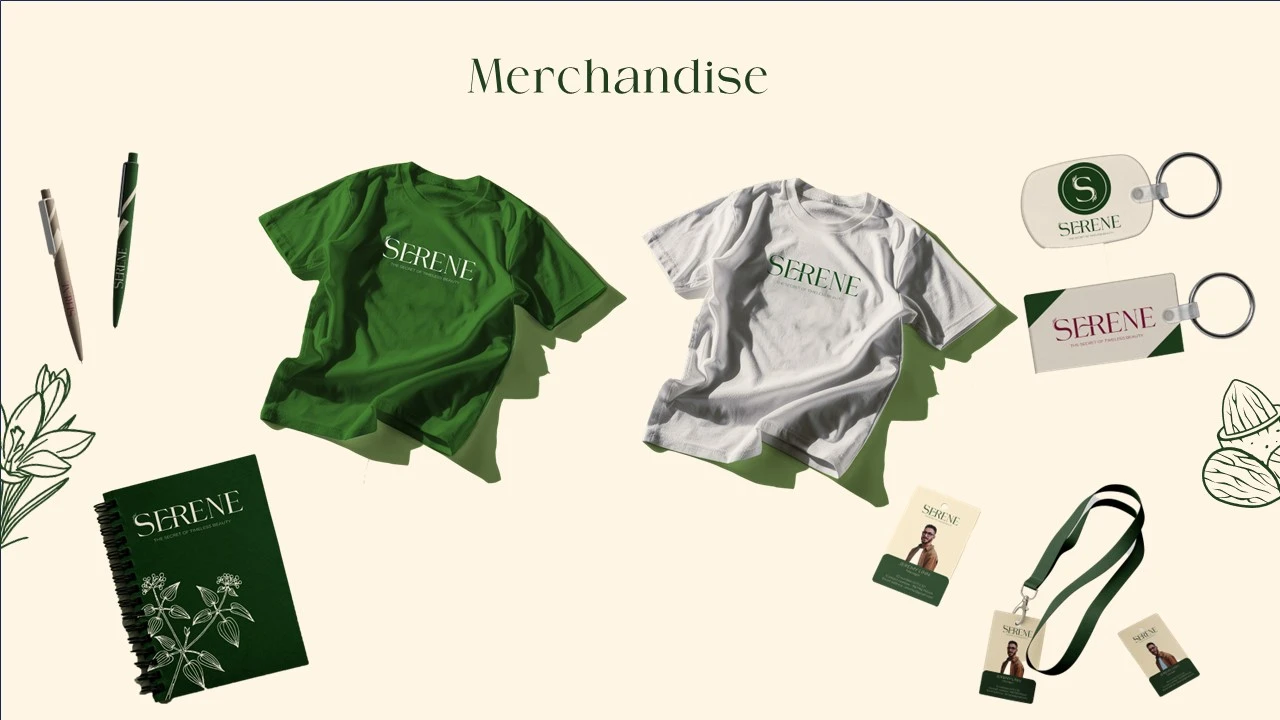 Serene blends traditional Ayurvedic ingredients with modern, elegant skincare design. The brand identity feels calm, pure, and premium, using earthy tones and minimalist layouts. Its visuals highlight natural elements like turmeric, neem, aloe, and sandalwood in a clean, contemporary style. Overall, Serene represents natural beauty reimagined with a soft, luxurious, and modern touch. Every detail reflects a soothing harmony between heritage and innovation.